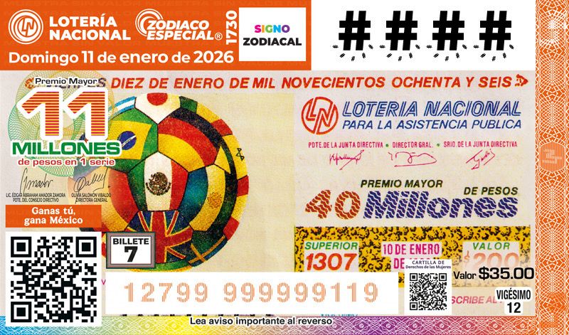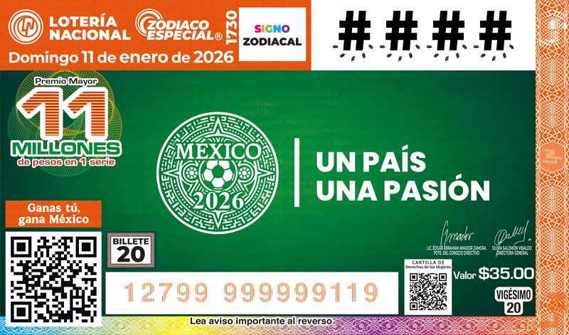 El Sorteo Zodiaco Especial No. 1730 cuenta con un Premio Mayor de 11 millones de pesos en una serie y una bolsa repartible de 43 millones de pesos, se llevará a cabo la noche del domingo 11 de enero a las 20 horas y tiene una emisión de dos millones 400 mil cachitos. La celebración del sorteo tendrá transmisión en vivo por el canal de YouTube institucional Sorteos Tradicionales de la Lotería Nacional.