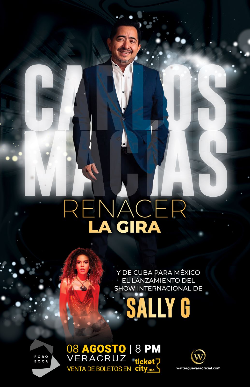 Carlos Macías y Sally G se presentan el Viernes 08 de Agosto en el Foro Boca de Boca del Río, Veracruz a partir de las 8pm y un día después el Sábado 09 de Agosto en Xalapa en el Gimnasio Nido del Halcón UV a partir de las 8pm. La venta de boletos está disponible en la plataforma https://www.ticketcity.mx/