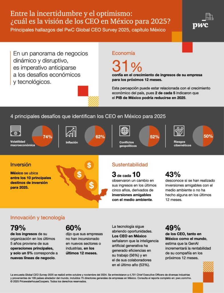 Ana Paula Jiménez, Socia Directora de PwC México, señaló: «Para navegar en un entorno cambiante como el actual, es imperativo anticiparse a los retos económicos y tecnológicos. Las organizaciones que se adapten con mayor rapidez hacia la búsqueda de nuevos negocios y aprovechen las oportunidades estarán mejor posicionadas para el futuro”. “Los CEO tenemos la oportunidad de preparar a las empresas y a nuestros equipos para transformar las amenazas en motores para la innovación y el crecimiento sostenible. De hecho, por segundo año consecutivo, los CEO encuestados a nivel global colocaron a México dentro de los 10 países considerados para inversiones de sus empresas en 2025”, agregó.